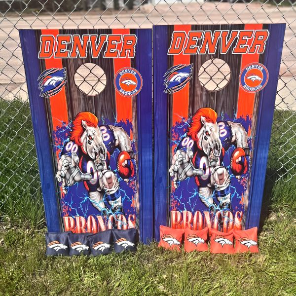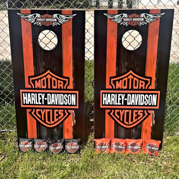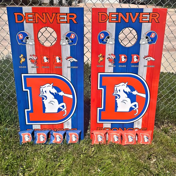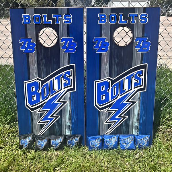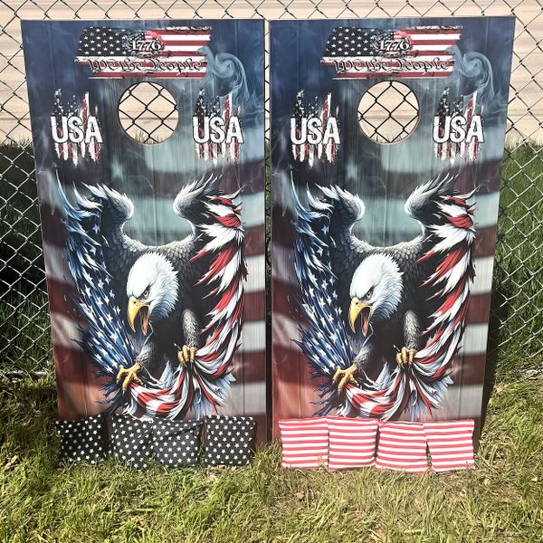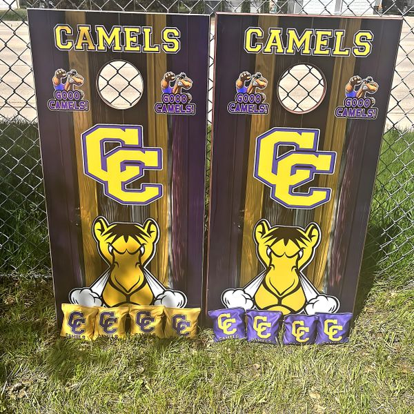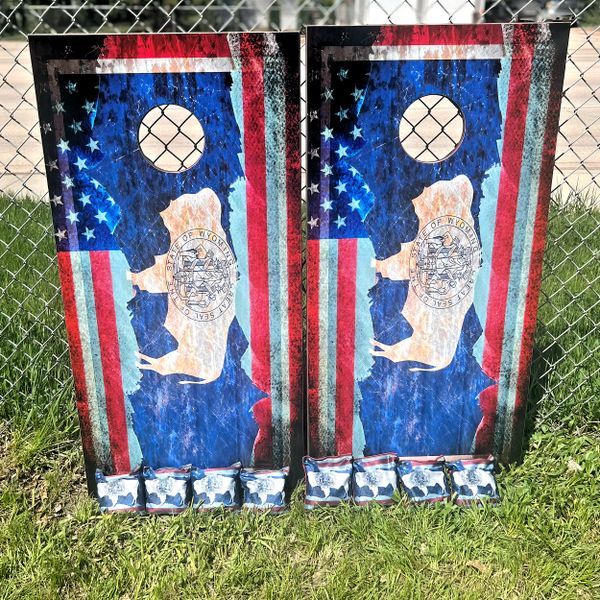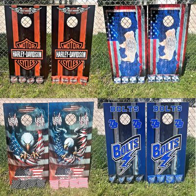 My boards are built to last for years. I use full 3/4” maple plywood that has UV & moisture protection baked into the wood. They are regulation size (24”x48”). All of the sides and ends are stained a beautiful cherry color then treated with spar-urethane for UV & moisture protection. Heavy duty legs that swing away for storage. Top graphics are weather resistant vinyl with a UV & moisture protective top coat. What sets mine apart as well is that I LASER ENGRAVE the end boards with anything you’d like! Last names, team names, logos etc. These bad boys are awesome! Message me below and let's get YOURS built!